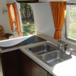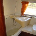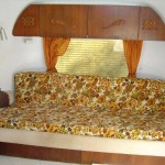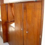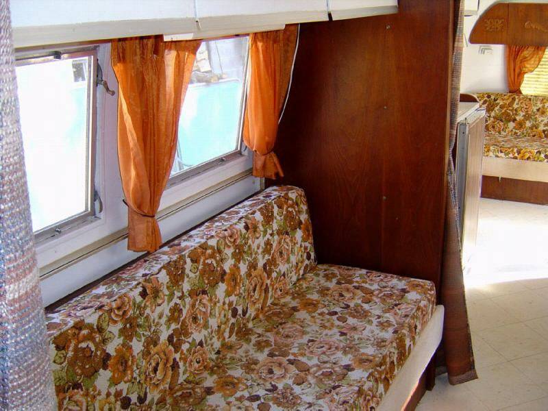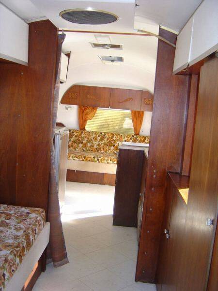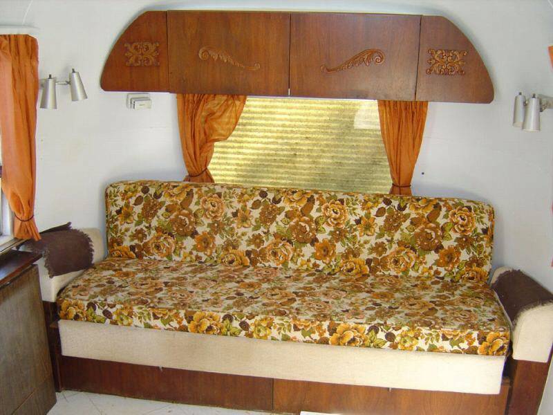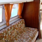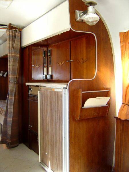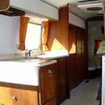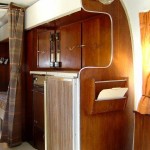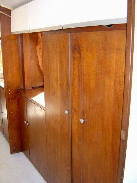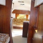 Honduran Mahogany interior. The Baroque appliques were added by the owner. Double bed layout with curbside galley.